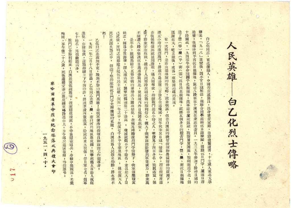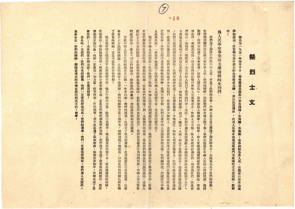 河北省张家口市档案馆馆藏的《祭烈士文》,是1951年4月10日在察哈尔省革命烈士纪念塔落成典礼大会上,悼念为人民革命事业光荣牺牲的革命烈士所作的祭文。