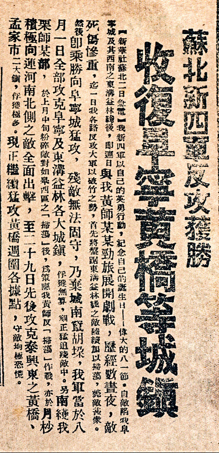 1941年7、8月间,此时正值抗日战争最艰难的战略相持阶段,皖南事变后重建的新四军在苏北站稳脚跟,却成为日军实施“以战养战”战略的重点进攻目标。1941年7月,日伪军集结重兵对盐城发起大规模“扫荡”,妄图摧毁新四军军部与华中抗日根据地核心。报道正是在这一背景下,传递出敌后战场的反击信号。